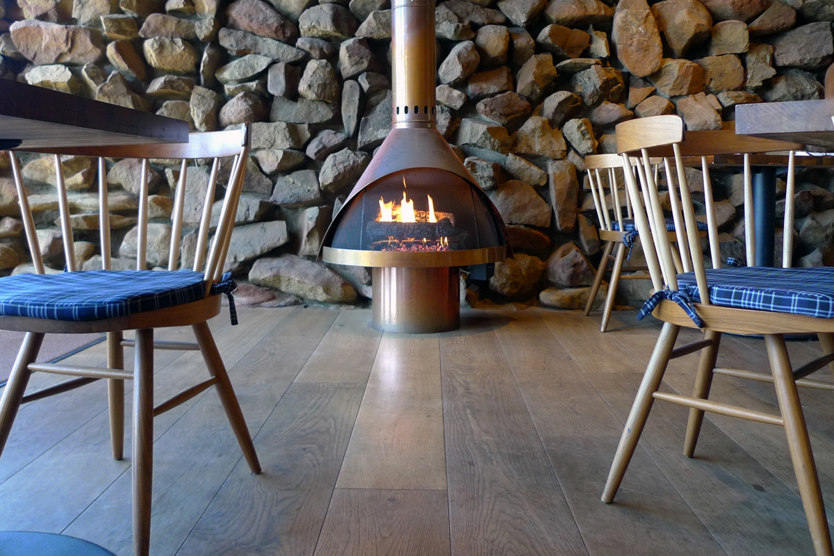 Next to the main gathering space at Timber Cove inn, a patio with a white marble Bufano sculpture, anchors an area for rest and recreation with a pool table, foosball and ping-pong. The hotel owner’s daughter has created a treasure hunt to explore the property. Inside under that fireplace, the bar has become a respite for travelers and locals to sip wine, cocktails and coffee and savor the slower pace of life on the coast. Guests can walk the bluffs over the Pacific Ocean by day and sit by the fire pit at night near the Bocce court.Guest rooms and suites are appointed in warm woods and have luxuriously comfortable beds with Pendleton blankets. Many rooms of the 46 rooms, with eight suites, look out over the Pacific Ocean. Guests are greeted with a record spinning on a turntable, and the in-room collection ranges from Frank Sinatra to Warpaint.