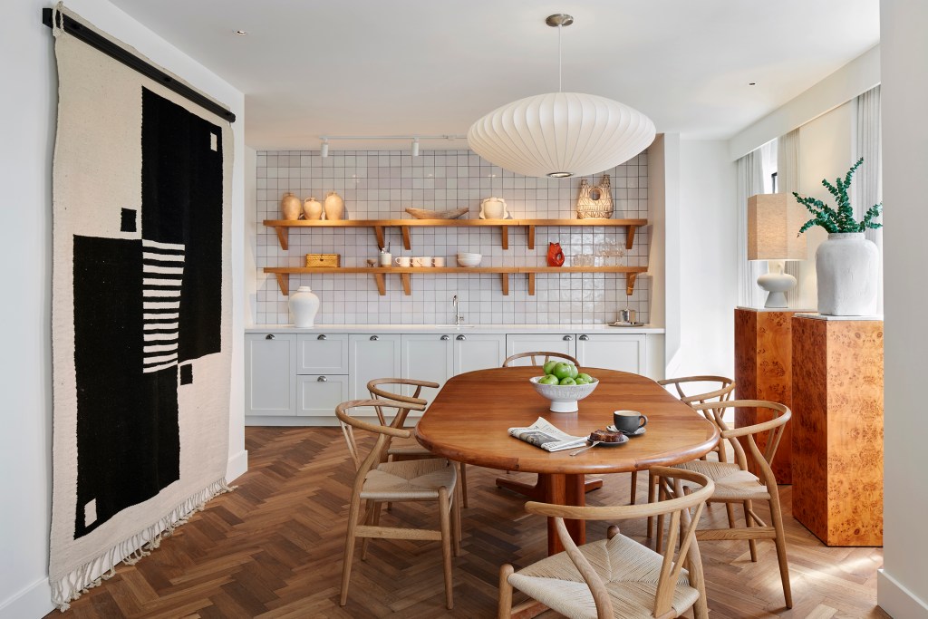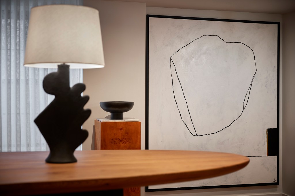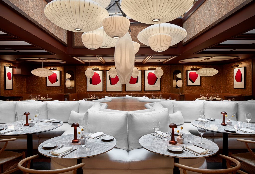 Opposite this gallery space, a cozy bar with lush butterscotch tufted banquettes is the preamble to a restaurant that’s tucked in the back. There, a central banquette loaded with white pillows plays right into Strauss’ residential narrative. A low ceiling is combated with stealthily placed pendant lights and wood trim formed into Art Deco shapes along with a central skylight adorned with a cluster of ethereal Herman Miller lanterns that Strauss says are reminiscent of clouds. The walls of the otherwise monochrome space are adorned with more of Strauss’ artwork. Lyle was intended to be a neighborhood restaurant, and a healthy assemblage from around Dupont Circle is already seen noshing on small plates like pea fitters and lamb meatballs or soul food like their crispy fried chicken with hot honey.