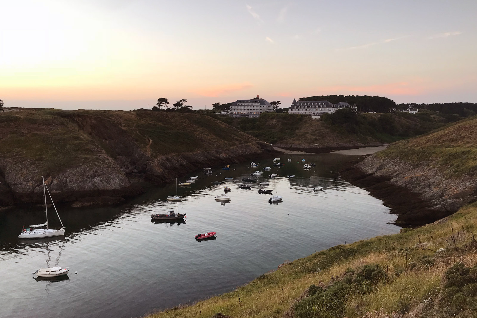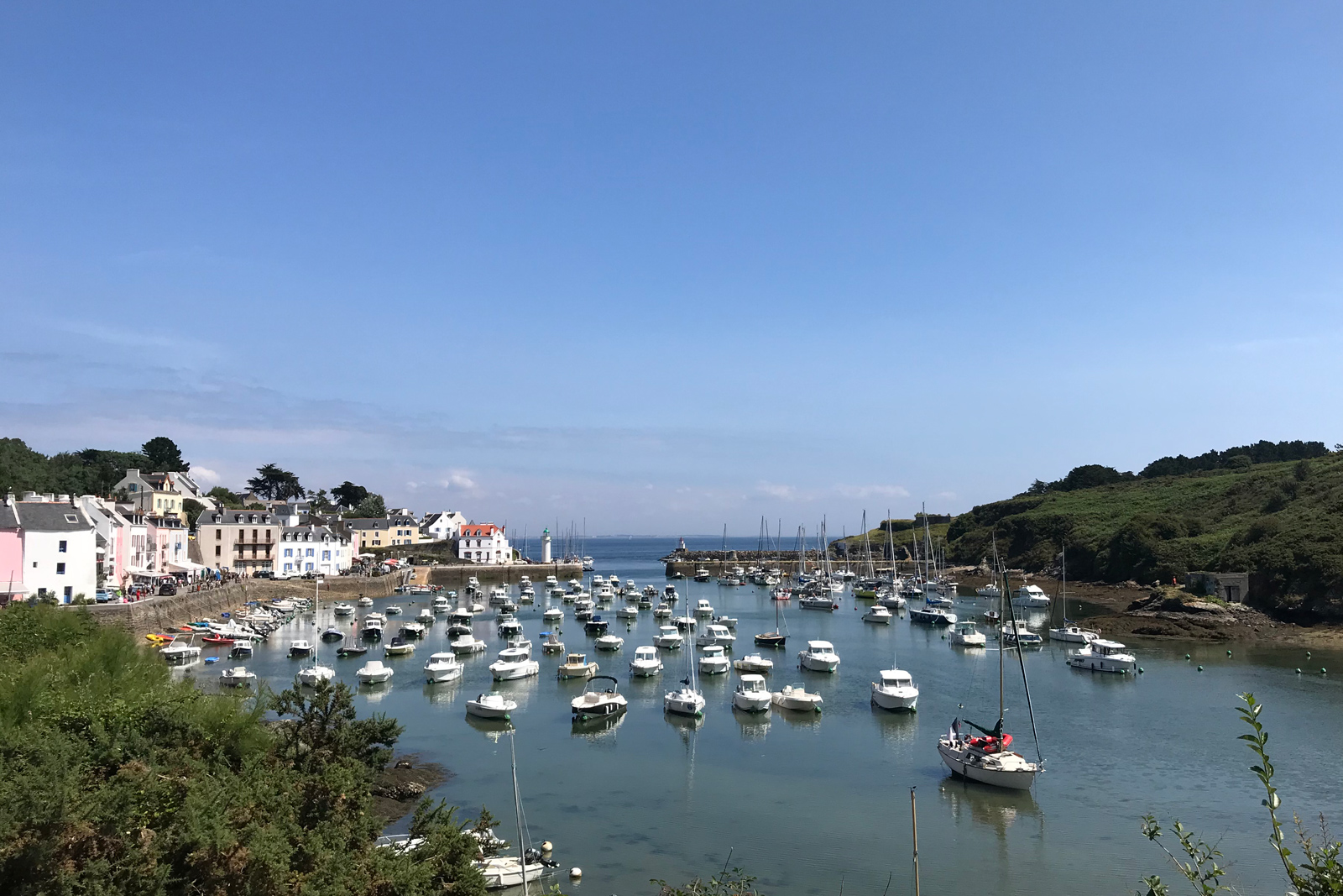A row of buildings wraps around the port of Sauzon, another (albeit tinier) scenic port city on Belle-Île. Among these historic homes, hotels and businesses, one finds