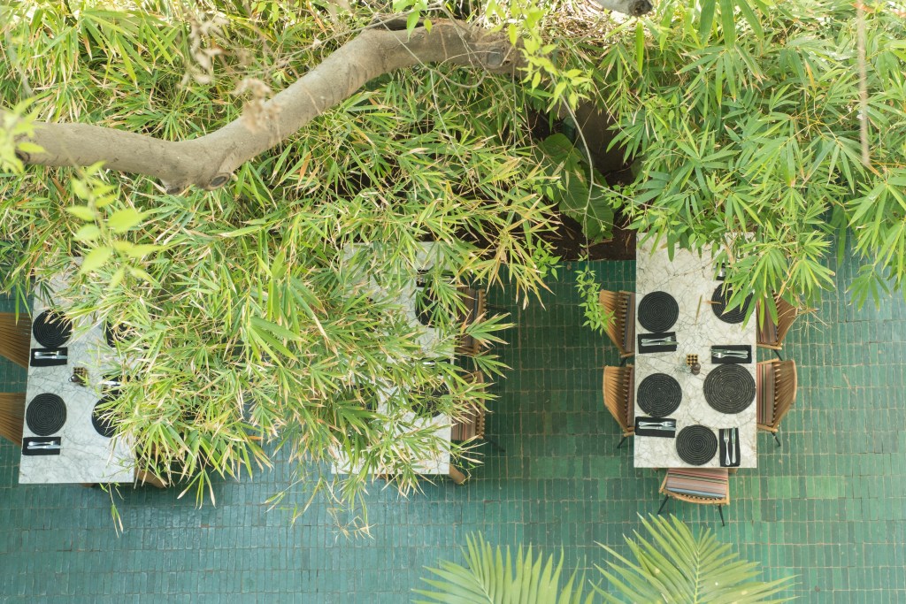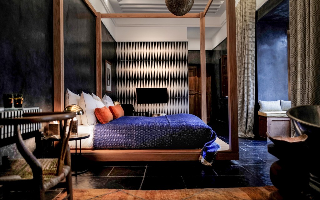 Riad Sakkan (which opened only a short time before the onset of the pandemic) provides a tranquil home base in the bustling city. It’s perfectly located inside the old medina walls—take a right out of the heavy twin doors and guests are a one-minute walk to Bab Laksour gate, close to nightlife and restaurants nestled atop the exterior wall, as well as cabs for getting around the greater city. A turn left leads to narrow alleyways and the bright shops in the souk. Owned by a Belgian couple who spent 1.5 years renovating the original building (part of which dates to the 17th century) it comprises 12 style-forward guest rooms, each with a unique configuration and modern Moroccan decor. There’s a pool in the below-ground courtyard, two private terraces with views to the city ideal for taking in the mid-morning sun, and dining on the massive terrace. The property attracts design enthusiasts who appreciate the blend of tradition and modernity, including the provocative photographs throughout, by the late Marc Lagrange, many shot on location in Morocco.