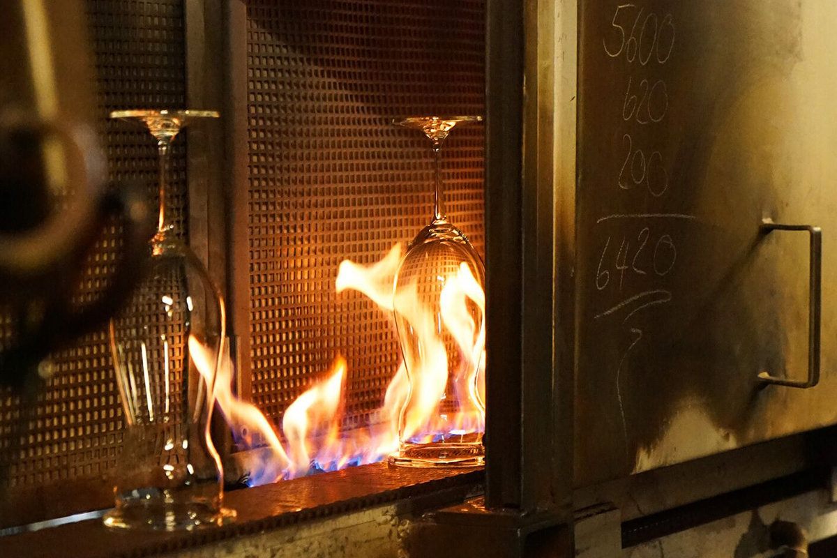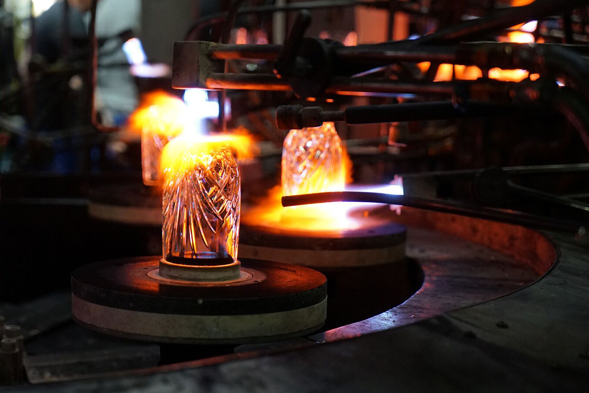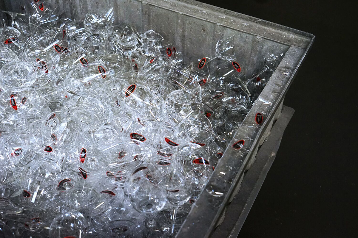 The company has invested heavily in its machine production and has two systems of production lines that are capable of making approximately 91,000 pieces per day and 28 million glasses per year. The mesmerizing, whizzing, fire-breathing machines that blow 1500-degree non-lead crystal into molds, mechanically attaches the stems, laser-trims, and fire polishes the glasses for a final time before the glasses are inspected for any flaws. Imperfect glasses (approximately 30% on a good day) are destroyed, crushed and re-melted into the crystal mix, a process that helps improve the quality of the crystal itself. Interestingly, if there is not enough recycled crystal content added to the mix each day, additional recycled crystal will be added to perfect the recipe.
