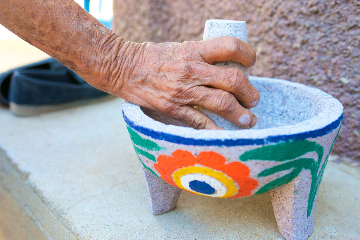 Maestro Tiburcio Sánchez was born in San Juan Teitipac in 1945 and has been stonecutting metates and molcajetes for the past 55 years. (A metate is a large, carved stone with a curved surface used to grind maize; a molcajete is the Mexican version of a mortar and pestle used to make salsas.) Outside in his yard, the 71-year-old sits on a small wooden stool, with a chisel and hammer, and relentlessly chips away at the stone, making the bumpy surface smooth and the stumpy legs sturdy. “People are using machines now,” he shouts over the clanking of metal on stone, “for faster finer curves.”